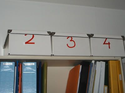 These are the DVD's and where we keep them. They're at the bottom of a closet-thing in the living room, because my parents don't want them on the shelves ("They're ugly!"). And, yes, that's two FOTR EE DVD's. We have no idea where the second one came from. I told my cousin he could borrow it and my sister told a friend she could borrow it. And then we had two. There are three DVD's missing: Fahrenheit 9/11, Bowling for Columbine and Ice Age. I don't know where the last one is. The video's are in these four boxes, but they're just boring...